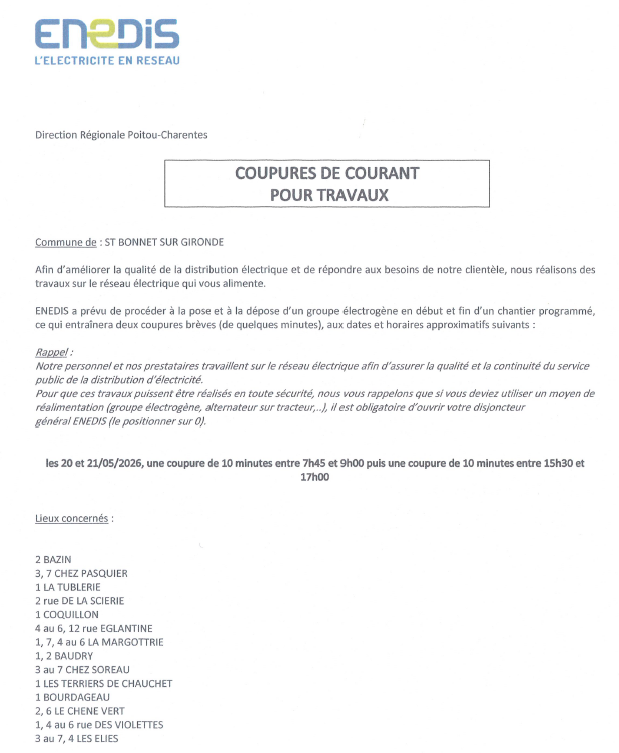 ENEDIS – Coupures de courant pour travauxPar Mairie / 20 mars 2026 Facebook Twitter LinkedIn Email Imprimer