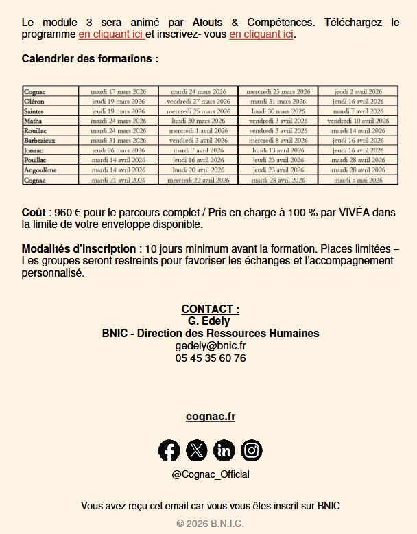Formation BNIC pour les viticulteurs Gratuite pour les viticulteurs (prise en charge par Vivea) + Ajouter à mon Agenda Google + iCal / Outlook export L'événement est terminé. Date 02 Mar 2026 Expiré ! Heure 08:00 - 18:00 Partagez cet événement mars 2026 Mar 07 2026 Loto, APE de l’Estuaire Pas d'événement actuellement programmé.
