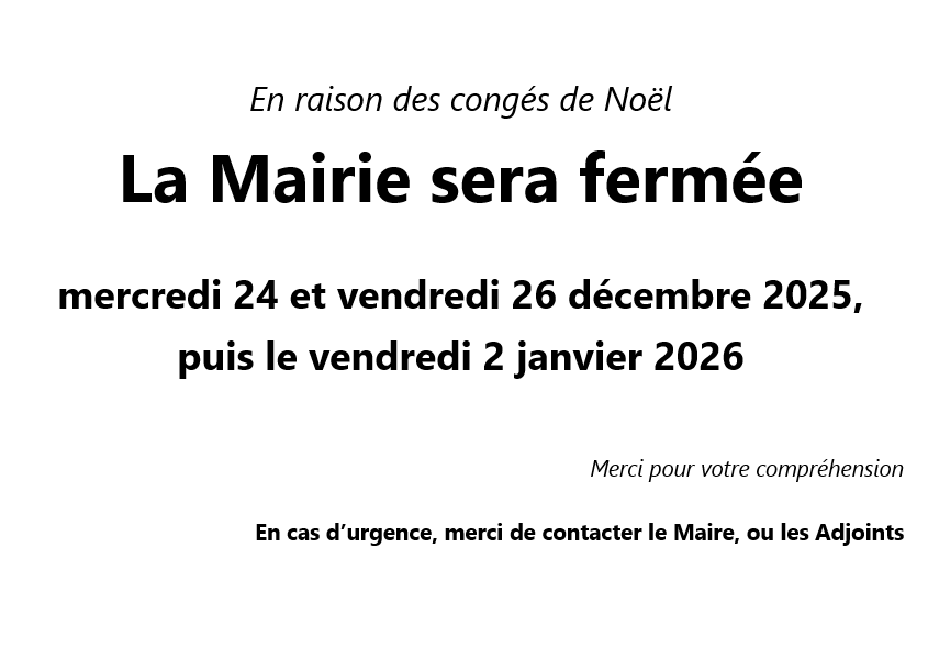 Fermeture mairie pour congés de NoëlPar Mairie / 15 décembre 2025 Facebook Twitter LinkedIn Email Imprimer