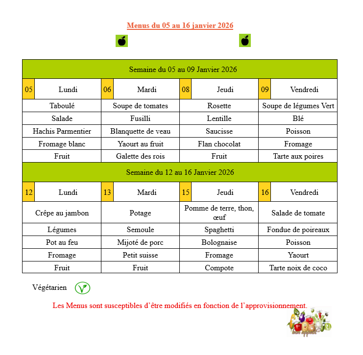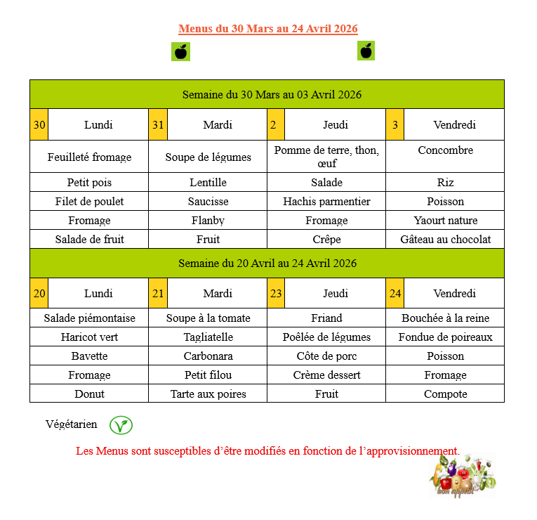 Les élèves sont pris en charge par la cuisinière et l’agent responsable de l’encadrement des élèves de 12h à 13h30.